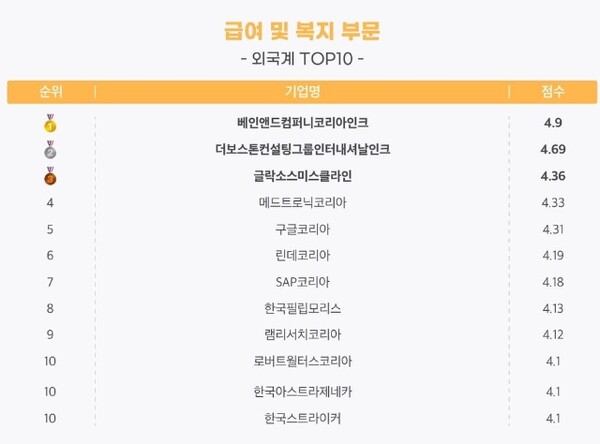 외국계에서는 베인앤드컴퍼니,BCG,글락소, 메드트로닉코리아로 구글코리아(5위)를 앞질렀다.