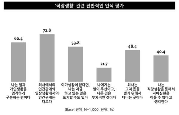 이런 태도는 직장생활의 의미에도 영향을 끼쳐, 직장인 2명 중 1명은 회사는 그저 돈을 벌기 위해서 다니는 곳이라는 생각도 숨기지 않았다.