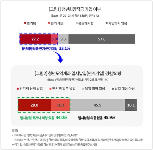 9일 데이터융복합·소비자리서치 전문 연구기관 컨슈머인사이트의 '금융 플랫폼 기획조사' 결과에 따르면, 청년희망적금 가입 여부 설문에 절반이 넘는 57.6%가 가입하지 않았다고 응답했다. 청년희망적금에 가입해 만기가 되거나 만기 예정이라는 응답은 각각 27.2%, 5.9%로 3명 중 1명꼴인 33.1%였다. 9.3%는 중도해지했다고 답했다. 이 조사는 지난 2~3월 만 20~34세 청년 658명을 대상으로 실시됐다.