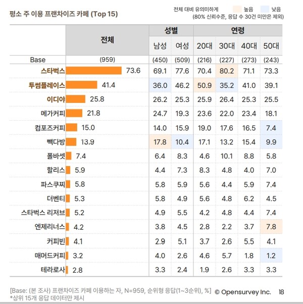 31일 오픈서베이가 발간한 <카페 트렌드 리포트 2022>에 따르면 스타벅스의 이용점유율은 73.6%로 나타났다. 투썸플레이스가 31.4%로 이디야(25.8%)를 앞질렀다.