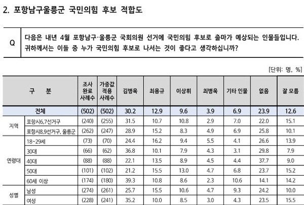 일간경북신문이 리얼미터에 의뢰, 포항남구울릉군 22대 국회의원 선거 여론조사를 실시한 결과 국민의힘 후보 적합도에서 김병욱 현 의원이 가장 높은 것으로 나타났다.