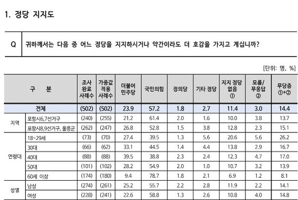 이번 조사는 지난달 31일과 11월 1일 이틀간 포항남구울릉군 18세 이상 남녀 502명을 대상으로 실시됐으며 95% 신뢰수준에 표본오차는 ±4.4%포인트다. 표본은 무선 90%, 유선 10%로 구성됐으며 12,617명 중 502명이 응답해 응답률은 4.0%였다.