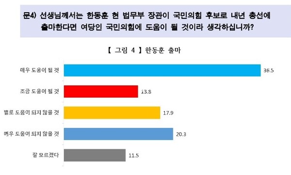 이 조사에 따르면 한동훈 장관이 총선에 국힘 후보로 출마하면 여당에 도움이 될 것으로 생각하냐고 묻자 ‘매우’ ‘조금’을 포함 도움될 것이라는 응답이 50.3%로 절반을 조금 넘었다. ‘별로’ ‘매우’ 등 도움이 되지 않을 것이라는 사람도 38.2%에 이르렀다.