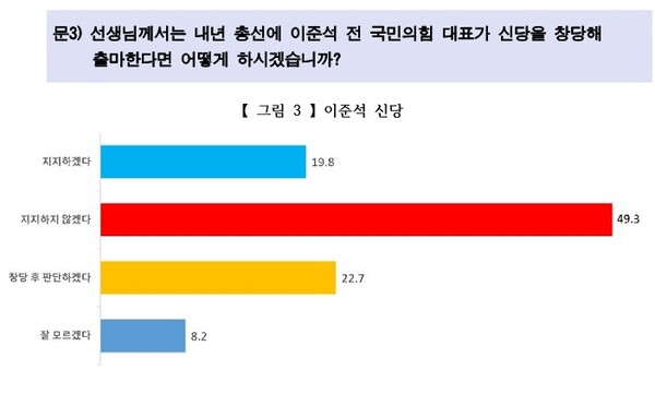 이준석 전 대표가 신당을 창당해 출마한다면 어떻게 하겠냐는 설문에는 '지지하지 않겠다'는 응답이 49.3%로 절반 가까이 됐다. '지지하겠다'는 응답은 19.8%에 머물렀으며, '신당 창당 후 판단하겠다'며 판단을 유보한 사람도 22.7%로 적지 않았다.