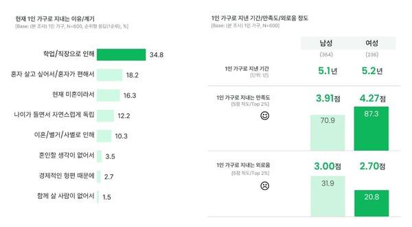 1인 가구로 지낸 기간은 남성과 여성 모두 평균 약 5년 정도 거의 비슷했으며, 1인 가구 생활에 대한 만족도는 여성이 남성에 비해 더 높은 데 비해, 1인 가구로 지내는 외로움은 남성이 여성에 비해 더 많이 느끼는 것으로 나타났다.