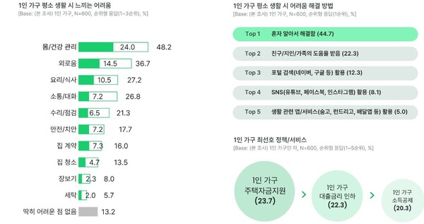 또한, 1인 가구의 85% 이상은 평소 생활에서 건강관리(48%), 외로움(37%) 등 신체적/정신적 어려움을 겪고 있는 것으로 나타났다. 다음으로는 요리/식사, 소통/대화 등에서 어려움을 느낀다는 응답이 각각 27%로 많은 편이었다.
