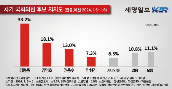제22대 국회의원선거 경북 안동시·예천군 여론조사 결과 국민의힘 김형동 현역의원이 ‘한동훈 후광효과’로 상승세인 것으로 나타났다.