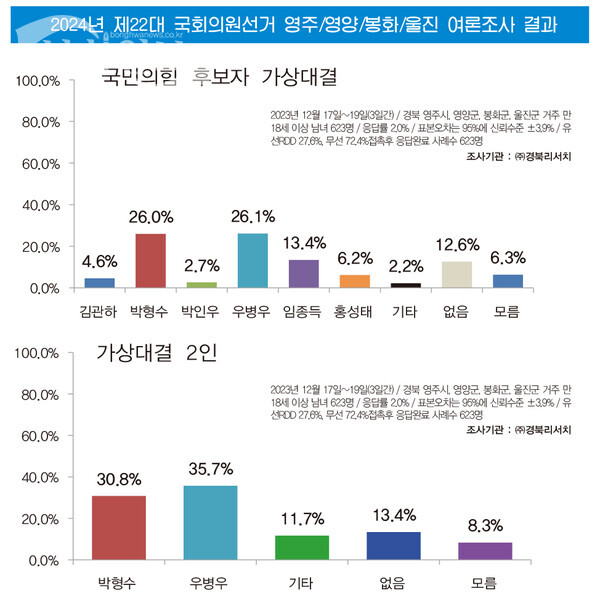 경북리서치는 22대 국회의원 선거를 앞두고 봉화일보·경안일보의 의뢰를 받아 영주·영양·봉화·울진 거주 만 18세 이상 남녀 623명을 대상으로 여론조사를 실시한 결과 이같이 나타났다고 27일 밝혔다.