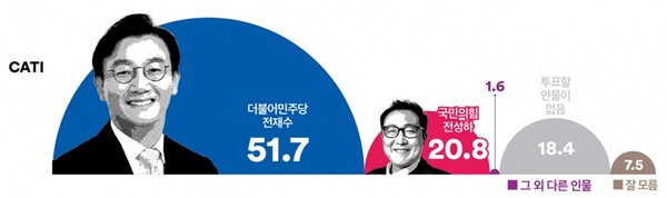 이어서 전재수 의원과 전성화 시 투자유치협력관과의 가상대결에서는 51.7% 대 20.8%로 격차가 조금 더 벌어졌다. 투표할 인물 없다는 부동층도 18.4%로 늘어났다.