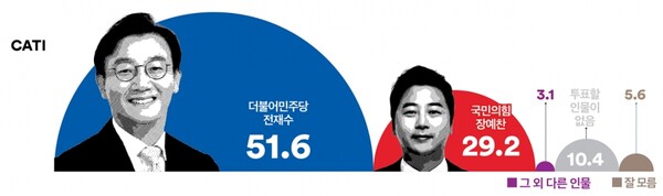 여론조사꽃은 9일 이 지역 만 18세 이상 남녀 520명을 대상으로 여론조사를 실시한 결과 이같이 나타났다고 밝혔다. 이 조사는 지난 3~4일 무선가상번호 활용 전화면접으로 진행됐으며 표본오차는 ±4.3%포인트(95% 신뢰수준)였다. 응답률은 14.1%였다.