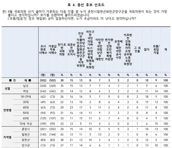 국힘 총선 후보 선호도를 보면 한기호 의원이 42%로 가장 높았으며 허인구 가짜뉴스·괴담방지 부위원장 16%, 이민찬 상근 부대변인 10%, 변지량 전 강원도민복지특별자문관 9%였다.