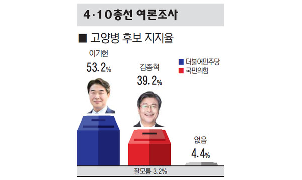 4·10 총선 고양병 선거구 여론조사에서 더불어민주당 이기헌 후보가 과반 지지를 얻어 국민의힘 김종혁 후보에게 우위를 보였다. 이 후보의 고공행진은 정권견제론에 제3지대 지지자들 상당수가 민주당으로 이동했기 때문으로 보인다.