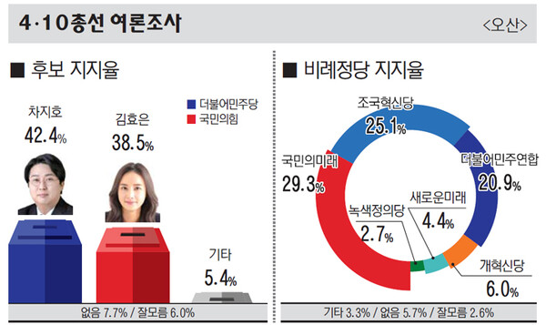 기호일보가 여론조사 전문기관인 한국여론평판연구소(KOPRA)에 의뢰해 지난 22∼23일 오산시 거주 유권자 503명을 대상으로 조사한 결과, 민주당 차지호 후보 42.4%, 국민의힘 김효은 후보 38.5%로 나타났다.