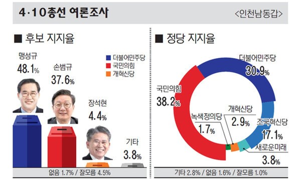 22대 총선 인천 남동갑 선거구 여론조사 결과 더불어민주당 맹성규 의원의 오차범위 밖에서 우세한 것으로 나타났다.