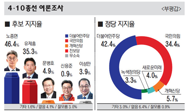 인천 부평갑 선거구 22대 총선 여론조사 결과 더불어민주당 영입 인재 노종면 예비 후보가 국민의힘 유제홍 예비 후보에게 오차범위 밖에서 우세한 것으로 나타났다. 개혁신당 문병호 예비 후보, 무소속 이성만 의원 등은 한자릿수 지지율에 머물렀다.