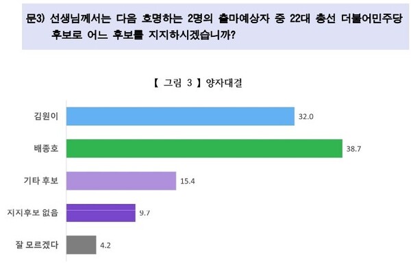 이는 다자대결 3위 이하 지지자들이 배종호, 김원이 두 명에게 일부 이동했지만 상당수는 기타후보로 남아 있기 때문으로 풀이된다. 배종호, 김원이 두 사람이 이들 후보들과 어떻게 합종연횡을 하느냐에 따라 순위가 바뀔 가능성이 있다는 얘기다.