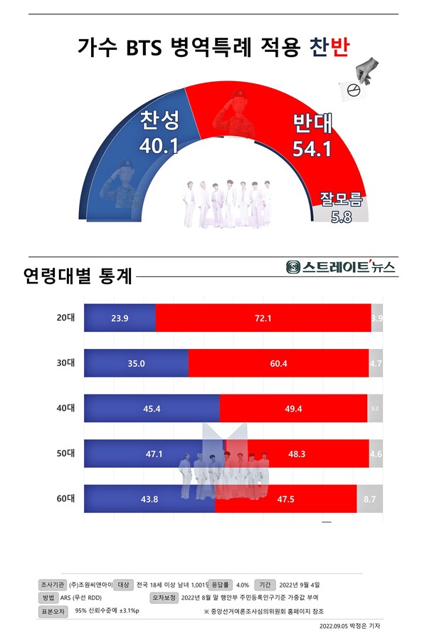 BTS 병역 문제에 대한 관심이 높아지자 지난 5일 인터넷 매체 [스트레이트뉴스]가 여론조사기관 조원C&I에 의뢰하여 전국 성인남녀 1,000명을 대상으로 실시한 여론조사 결과를 바탕으로 “BTS 병역 의무 ‘찬성 54% vs 반대 40%’”라는 제목의 기사를 실었다. 국민들의 관심이 큰 사안인 만큼 여러 언론의 인용보도가 뒤따랐다.