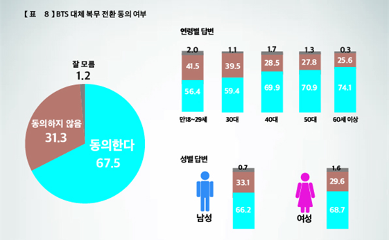 Q. 귀하께서는 BTS의 병역을 대체복무로 전환하는 것이 동의하십니까? 동의하지 않으십니까?