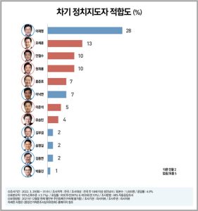 이재명, 차기 정치지도자 적합도 28%로 1위