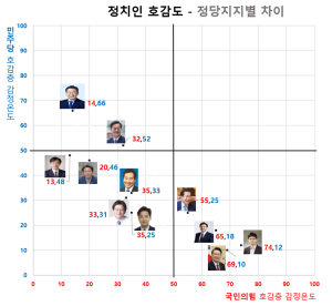 ‘무당층’ 호감도…한동훈 37도, 홍준표 36도, 오세훈 36도, 김동연 35도 순 윤 대통령, 이재명 민주당대표, 이준석 전 국힘대표 각각 30도 수준 비슷