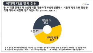 이재명 대표 ‘헬기 전원’ 여론…”부적절했다” 48% vs “적절했다” 43%