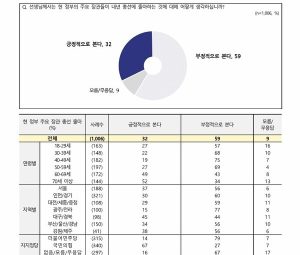 정당지지 : 국민의힘 45%, 민주당 27%, 정의당 3%, 지지정당 없다 16% 윤 대통령 국정운영 : 긍정평가 42%, 부정평가 50%
