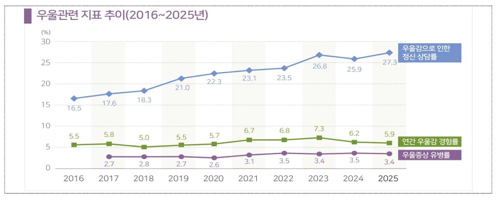 질병관리청이 전국 성인 23만 명을 분석한 결과, 수면 이상 시 우울 증상 위험이 2.1배 높아지는 것으로 나타났다. 국내 성인 우울 증상 유병률은 2017년 대비 25.9% 증가했으며, 기초수급가구와 70대 이상 1인 가구의 위험이 특히 높다.
