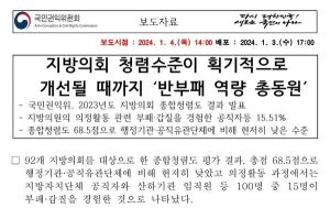 국민권익위, 전국 지방자치단체 92곳 설문조사 지방의원 비리, 일반 공직자에 비해 7.5배 높게 나타나 지방의회 청렴도 68.5점…행정기관·공직유관단체 80.5점보다 크게 낮아