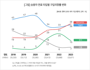 [신차 연료타입 선호도] 하이브리드 38%, 가솔린 36%, 전기차 15%, 디젤 7% 순 하이브리드 강점 연비 효율성과 친환경성 입증