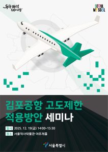 오는 2030년, 개정된 국제민간항공기구(이하 ICAO) 고도제한 국제기준 전면 시행을 앞두고 김포공항 주변의 고도제한 합리적 적용 방안을 다각적으로 논의하기 위해 서울시와 전문가가 머리를 맞댄다. 서울시는 고도제한 국제기준 개정에 따른 김포공항 주변 고도관리 방향과 국내 적용 방안을 모색하기 위해 12.19.(금) 14시 서울역사박물관(야주개홀)에서 ‘김포공항 고도제한 적용방안’ 세미나를 개최한다고 밝혔다. 세미나에는 지역 주민을 비롯해 서울시의원, 관련 분야 전문가, 국토교통부·지자체…