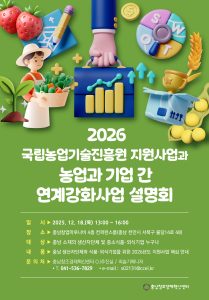 충남창조경제혁신센터(이하 충남혁신센터)는 충남도 내 생산자단체와 식품기업을 대상으로 12월 18일(목) ‘2026 농업과 기업 간 연계강화사업 설명회’를 개최한다. 농업과 기업 간 연계강화사업은 충남에서 생산되는 농산물을 활용하는 가공식품기업과 생산자단체를 연결해 서로 성장할 수 있는 상생 모델을 발굴·확산하는 데 목적을 둔 사업이다. 참여 대상은 충남 소재 생산자단체(작목반, 영농조합법인, 농업회사법인 등)와 식품기업이며, 관심 있는 단체·기업은 누구나 참여할 수 있다. 설명회에서는…