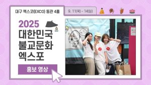 ‘2025대한민국불교문화엑스포(Korean Buddhism Culture Expo)’가 오는 9월 11일(목)부터 14일(일)까지 4일간 대구 엑스코(EXCO) 동관 4홀에서 막을 올린다. 올해로 4회째를 맞는 이번 엑스포는 찬란한 불교문화유산이 살아 숨 쉬는 대구·경북 지역의 풍부한 불교 자원과 인프라를 기반으로 전통불교문화 산업의 진흥과 확산을 도모하는 대표 행사다. 2025대한민국불교문화엑스포 사전 홍보 영상 ‘2025대한민국불교문화엑스포’ 포스터 ‘2024대한민국불교문화엑스포’ 전시장 전경 ‘2024대한민국불교문화엑스포’ 전시장 전경 ‘2025대한민국불교문화엑스포’는 불교신문과 BBS대구불교방송이 주최하며,…