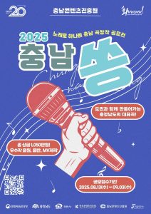 충남콘텐츠진흥원(원장 김곡미, 이하 진흥원)은 충청남도의 정체성과 감성을 담은 창작 음악을 발굴·확산하기 위한 ‘충남쏭(song) 공모전’을 8월 13일(수)부터 9월 3일(수)까지 개최한다고 밝혔다. 이번 공모전은 ‘음악으로 기억하는 충남’을 주제로, 충남의 장소·인물·사건·풍경·감정 등 지역의 이야기를 음악으로 풀어내는 창작곡을 모집한다. 개인 또는 팀 단위로 참가할 수 있으며, 연령이나 거주 지역에 제한 없이 누구나 지원 가능하다. 공모전은 예선과 결선의 2단계로 진행된다.…
