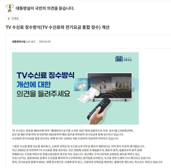 대통령실이 3월 9일부터 1개월 동안 홈페이지 국민제안 코너에서 수렴한 국민 의견이 일제히 소개되고 있다. TV 수신료를 전기요금 항목으로 의무 납부하는 방식은 개선이 필요하다는 데 대해 추천(찬성)이 96%로 나왔다고 말이다. 이런 결과에 힘입어 “국민의 뜻을 따를 것이다. 확실하게 손을 보겠다”고 했단다.