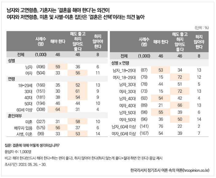 13일 발표한 한국리서치 <여론속의 여론>보고서에 따르면, "결혼에 대해 어떻게 생각하느냐"는 물음에 대해 전체 응답자의 46%가 결혼을 해야 한다고 답했다(반드시 해야 한다 9%, 하는 편이 좋다 37%).