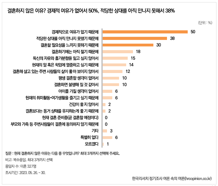 특히, 미혼 응답자를 대상으로 결혼을 하지 않은 이유를 물어본 결과, ‘경제적으로 여유가 없기 때문에(50%)’라는 응답이 가장 높았고, 디음으로 ‘적당한 상대를 아직 만나지 못했기 때문에(38%)’, ‘결혼할 필요성을 느끼지 못하기 때문에(30%)’라는 응답이 뒤를 이었다.