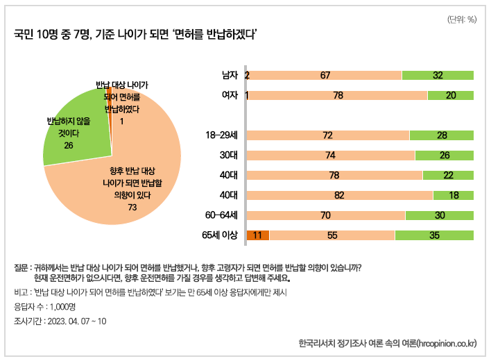 우리 국민들은 고령자의 운전과 관련 제도에 대해 어떻게 인식하고 있을까? 한국리서치 '여론 속의 여론'팀에서 지난 4월 7일~10일 전국 만 18세 이상 남녀 1,000명을 대상으로 고령자 운전 및 면허 반납 제도에 대한 인식을 조사했다.