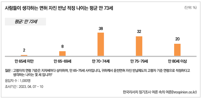 결국 응답자의 90%가 적어도 만 70세 이상은 되어야 '면허 반납 적정 나이'로 인식하고 있는 것으로 나타나,  현실 제도와 국민들의 인식 사이에는 상당한 괴리가 있음을 보여주었다..