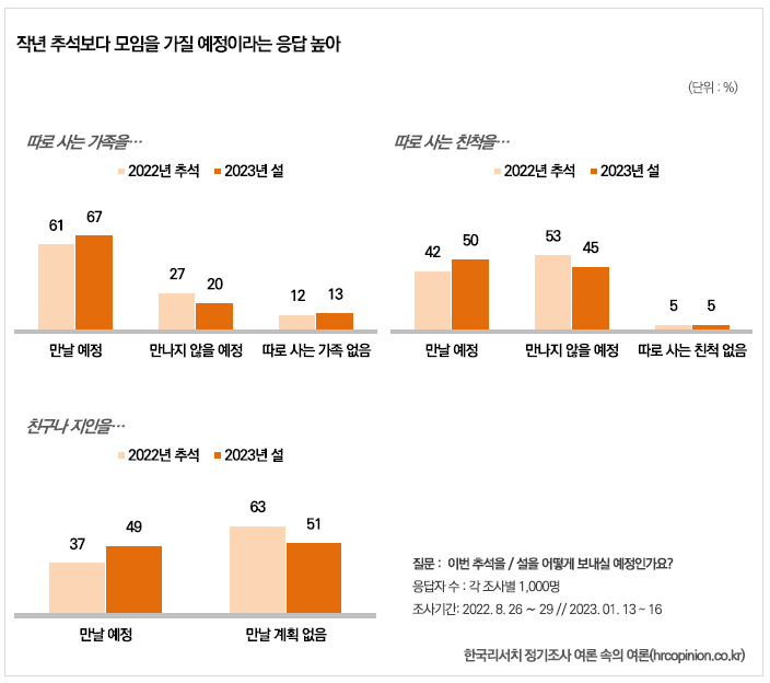 여론조사기관 한국리서치가 설 연휴를 1주일 앞둔 지난 1월 13~16일 전국 만 18세 이상 남녀 1,000명을 대상으로 설 모임 및 일정 계획에 대해 물어본 결과, 전체 응답자의 67%가 ‘설에는 가족을 만날 예정’이며, 20%는 따로 사는 가족이 있기는 하지만, 이번 설에는 만나지 않을 예정이라고 답했다.