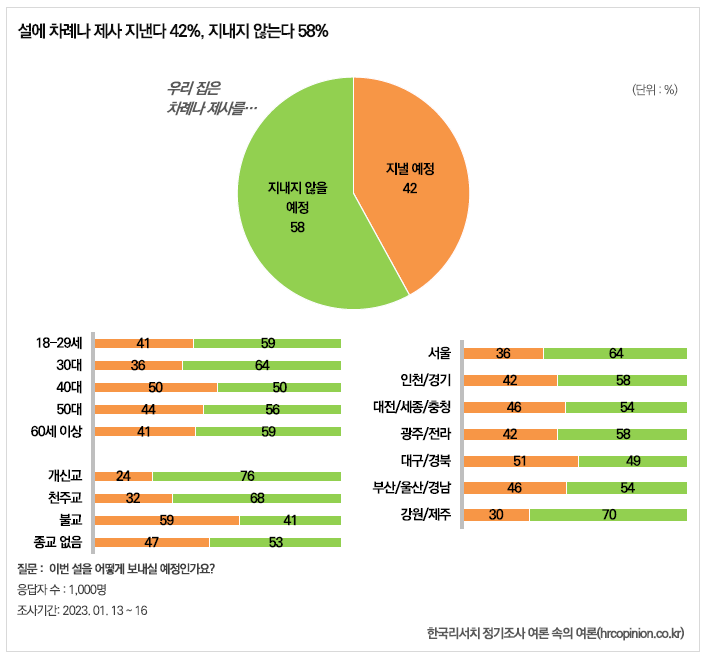 이러한 세태를 반영하듯, 이번 설 명절에 ‘차례나 제사를 지내지 않을 예정’이라는 응답이 58%로 ‘지낼 것’이라는 응답(42%)보다 더 많은 것으로 나타났다. 대구‧경북지역(49%)을 제외한 전 지역에서 이번 명절에 차례나 제사를 지내지 않을 예정이라는 응답이 더 많았다.