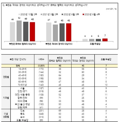 22일 발표된 전국지표조사(NBA)에 따르면, 북한에 대해 '화해와 협력의 대상'이라는 응답이 48%였으며, '적대와 경계의 대상'이라는 응답 또한 45%로 서로 비슷한 결과가 나왔다.