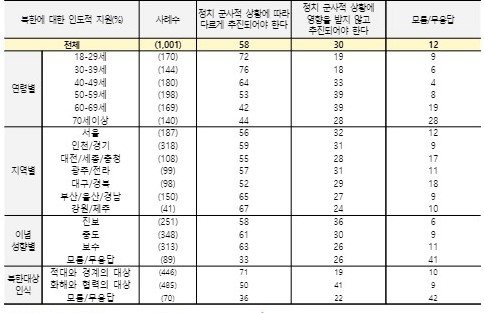 한편, 북한에 대한 인도적 지원은 어떻게 추진되어야 한다고 생각하느냐는 질문에 대해서는 '정치 군사적 상황에 따라 다르게 추진되어야 한다'는 응답이 58%로 ‘정치 군사적 상황에 영향을 받지 않고 추진되어야 한다'는 응답 30% 보다 두 배 가까이 많았다.