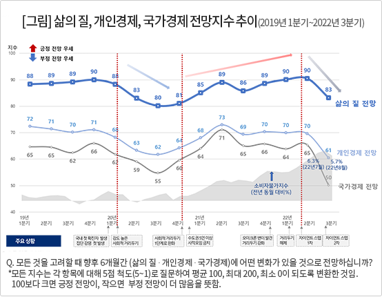 소비자리서치 전문기관 컨슈머인사이트가 매주 1,000명을 대상으로 실시하는 ‘주례 소비자체감경제 조사’에 따르면, "모든 것을 고려할 때 향후 6개월간 삶의 질에 어떤 변화가 있을 것으로 전망하는지"를 묻는 '삶의 질' 전망지수가 83을 기록하면서 2분기의 90 대비 7포인트가 단번에 하락했다. 코로나 발생 이후 기록한 분기 최대 하락폭으로 최근 소비자들의 경제적 불안감을 그대로 보여주고 있다.