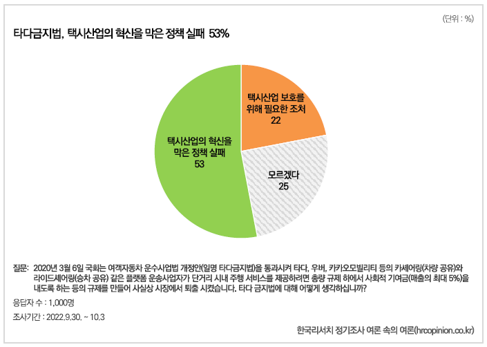 여론의 반응은 일단 긍정적이다. 타다금지법에 대해 '택시산업의 혁신을 막은 정책 실패라고 생각한다'는 응답이 53%로 과반을 넘어섰다. 택시 대란의 해결 방법으로 타다금지법 규제를 완화하는 것에 대해서도 찬성한다는 응답도 57%로 높은 편이었다.