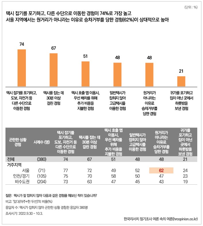 또한 ‘택시 호출앱 이용시, 우선 배차를 위해 추가 비용을 지불한 경험’이 있다는 응답도 절반 이상인 51%나 됐다. 서울 지역에서는 ‘원거리가 아니라는 이유로 승차 거부를 당한 경험’이 있다는 응답도 62%로 타지역에 비해 높게 나타났다.