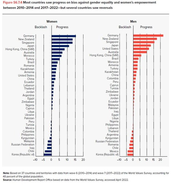 유엔개발계획(UNDP)이 발간한 2023년 젠더사회규범지수(GSNI:Gender Social Norms Index)) 보고서에 따르면 한국은 별도 조사대상 37개국 가운데 성평등에 대한 편견이 가장 심화한 나라로 나타났다.