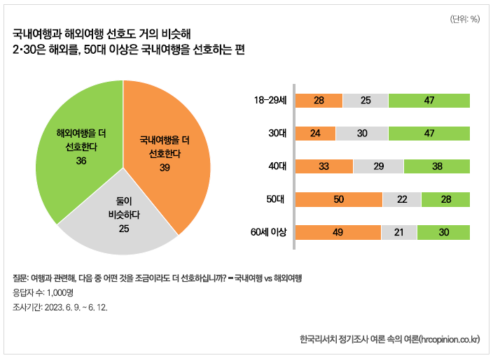 12일 발표한 한국리서치 <여론속의여론> 보고서에 따르면, 우리 국민들의 국내 여행과 해외여행 선호도를 조사한 결과  "국내여행을 선호한다"는 응답(39%)과 "해외여행을 선호한다"는 응답(36%)이 거의 비슷했으며, "국내여행과 해외여행 선호도가 비슷하다"는 응답이 25%를 차지했다.