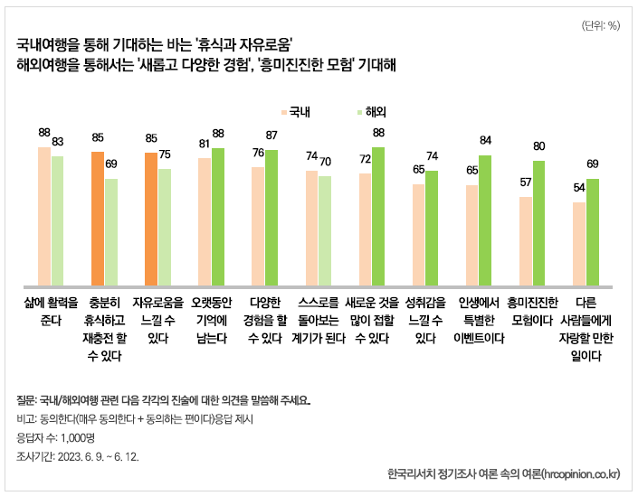 여행에 주는 즐거움이나 기대 측면에서 볼 때도 국내여행과 해외여행을 통해 휴식, 자유, 새로운 경험, 성취감 등을 얻을 수 있다는 데 공통적으로 과반 이상이 동의한다.