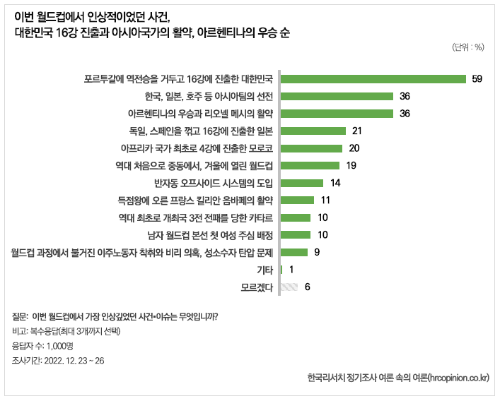이 외에도 ‘독일, 스페인을 꺾고 16강에 진출한 일본(21%)’, ‘아프리카 국가 최초로 4강에 진출한 모로코(20%)’, ‘역대 최초로 중동에서, 겨울에 열린 월드컵(19%)’ 등이 이번 월드컵에서 인상적인 사건으로 꼽혔다.