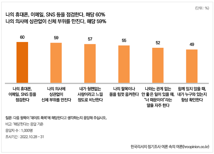 먼저 ‘통제’ 유형에 해당하는 사례로 ‘나의 휴대폰, 이메일, SNS 등을 점검한다'에 대해서는 응답자의 60%가 데이트 폭력에 해당한다고 답했으며, '성적 폭력'에 해당하는 사례로 ‘나의 의사에 상관없이 신체부위를 만진다’에서도 엇비슷하게 응답자의 59%가 데이트 폭력으로 여기는 것으로 나타났다.